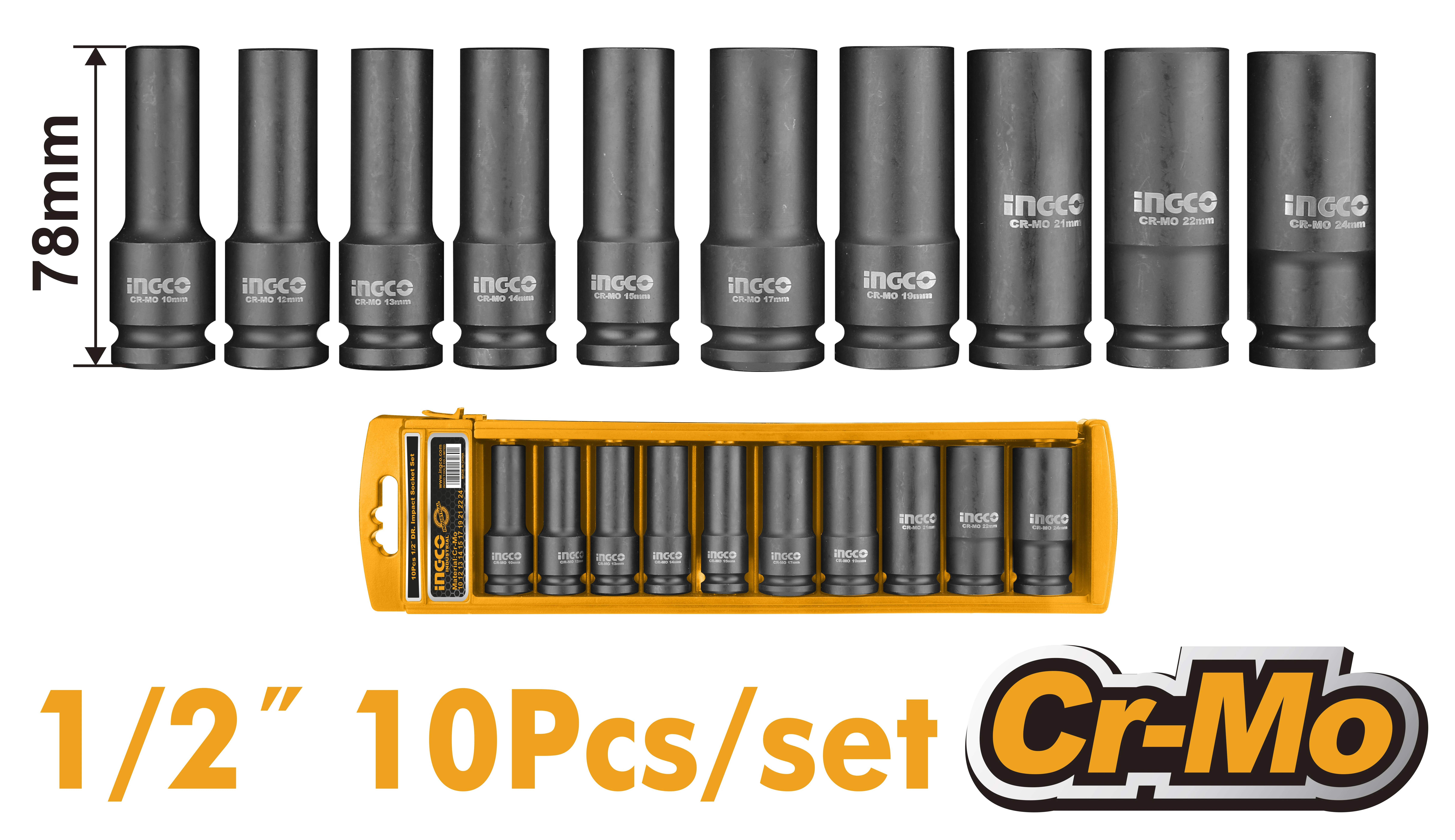 10 pzas 1/2 «DR. Juego de dados de impacto profundoTamaño 10.12.13.14.15.17.19.21.22.24mmlongitud: 78 mmMaterial: CrMoTratamiento térmicoEmbalado por percha de plástico