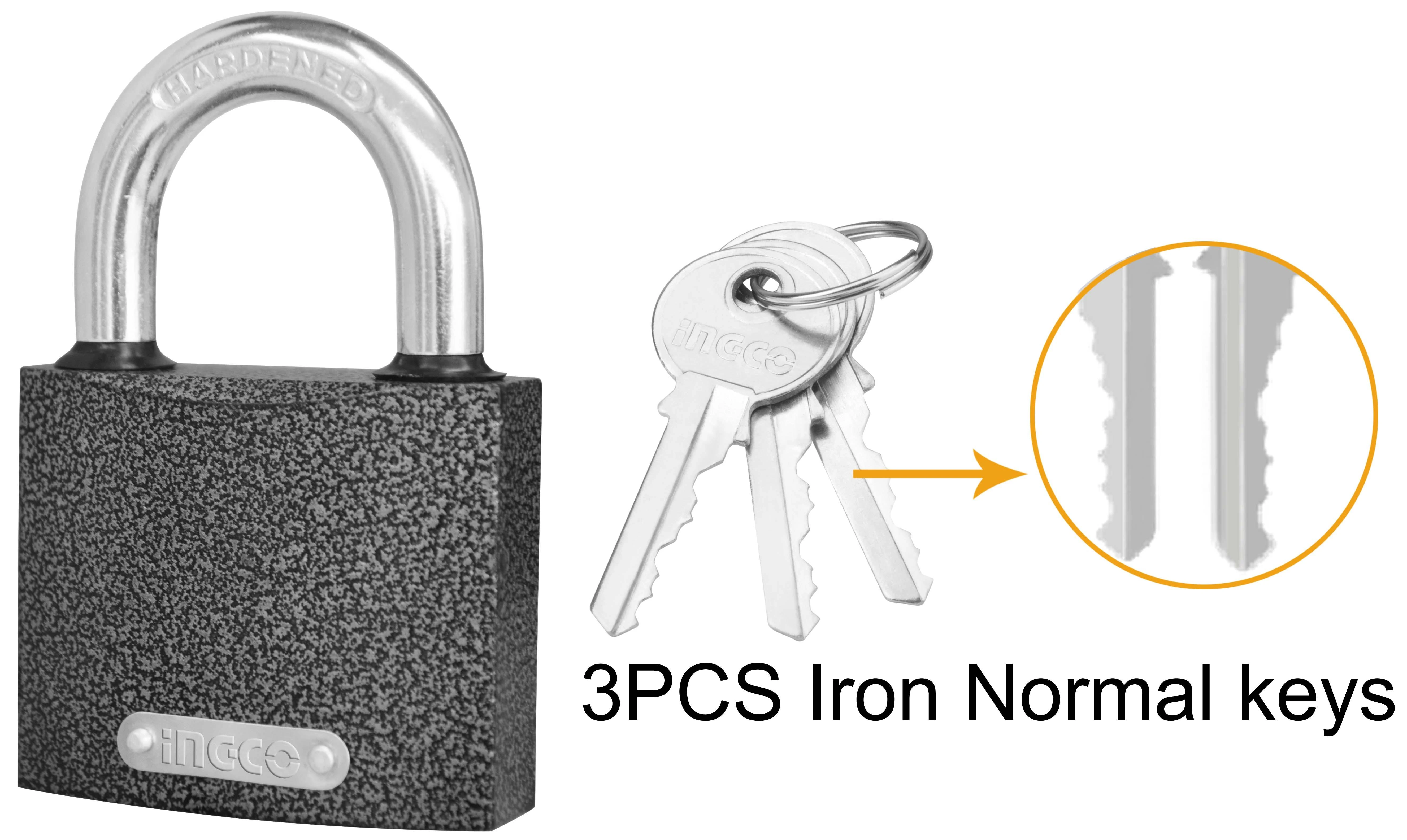 Tamaño: 75 mmMaterial: hierroPeso: 714gCon 3 pzas de llaves de hierroCilindro de cerradura de latónCon cubierta de goma impermeableEmbalado por caja de color