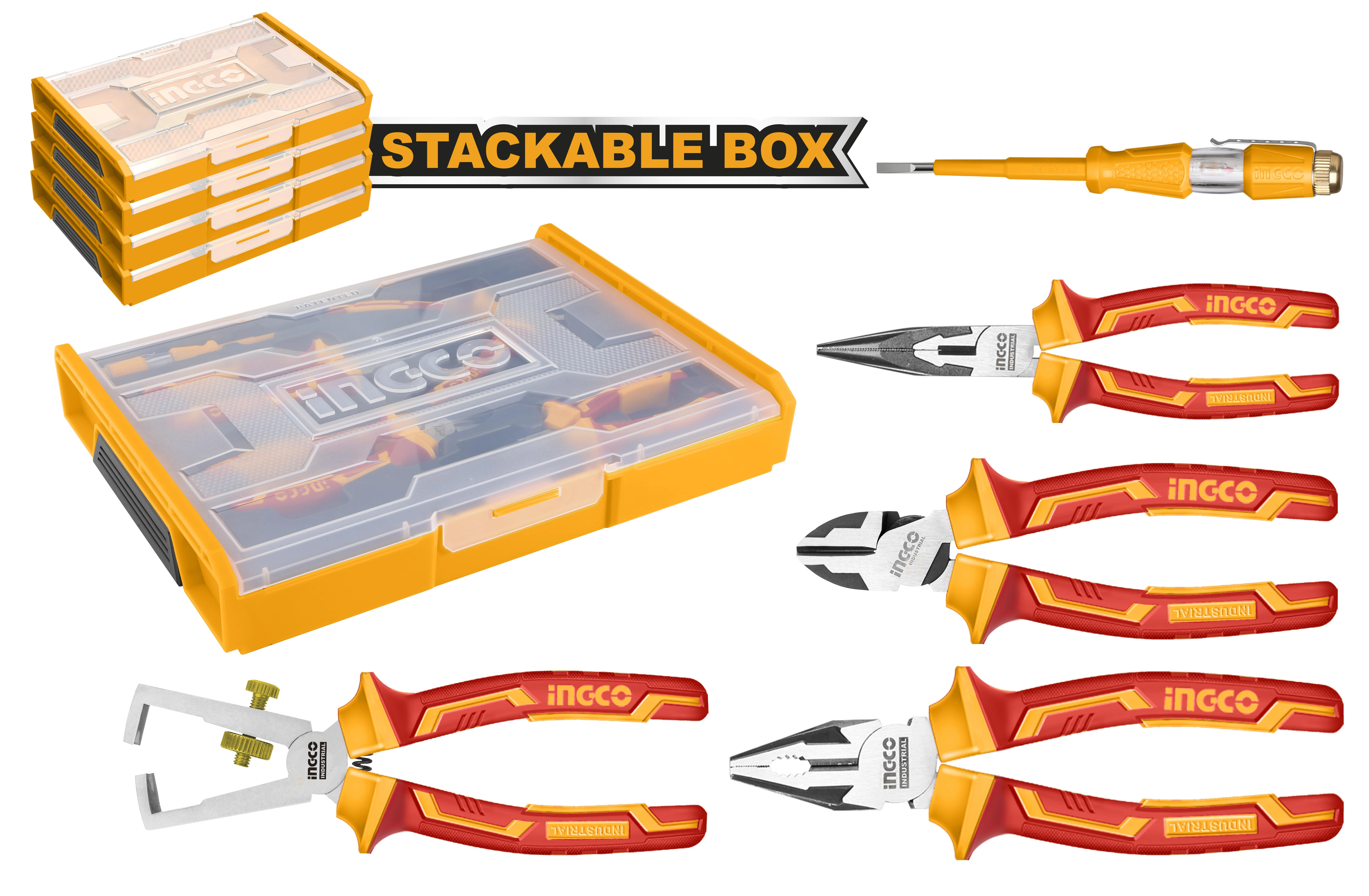 Juego de herramientas manuales aisladas de 5 pzaIncluye1 pza de alicates de combinación con aislamiento de 7 «1 pza de alicates de corte diagonal aislados de 6 «1 pza de alicates de punta larga con aislamiento de 6 «Alicates para pelar cables aislados de 1 «6»1 pza de lápiz de prueba voltage Tensión de prueba 100-500VCA ACEmbalado por caja de plástico apilable «