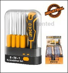 JJuego de destornilladores intercambiablesIncluye3 pza SL3X65 SL5X65 SL6X653 pza PH0X65 PH1X65 PH2X65Removedor de tachuela 1pza 5X65Punzón de arañazos 1pza 3X65Material CR-Vcon 1 pza de mango intercambiable INGCO estiloEmbalado por caja de plástico