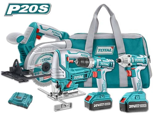 Voltaje: 20V Con 1 taladro inalámbrico de iones de litio. Con 1 controlador de impacto de iones de litio. Con 1 sierra caladora de iones de litio. Con 1 sierra circular de iones de litio. Con paquete de batería de 2pcs 4.0Ah Con cargador 1pcs Taladro inalámbrico de iones de litio (TDLI20024): Velocidad sin carga: 0-400/0-1500 rpm Par máximo: 45NM Capacidad del mandril: 0,8-10 mm Ajustes de par: 15+1 Engranaje mecánico de 2 velocidades Luz de trabajo integrada Indicador LED de energía de la batería Controlador de impacto de iones de litio (TIRLI2002): Motor sin escobillas Vástago hexagonal: 1/4″» Velocidad sin carga: 0-1300/0-2100 rpm Tasa de impacto: 0-2000/0-3300/min Par máximo: 170NM Sierra caladora de iones de litio (TJSLI18651): Velocidad sin carga: 2400 rpm Capacidad de corte: metal: 8 mm Madera: 80 mm Con hoja de 5 piezas