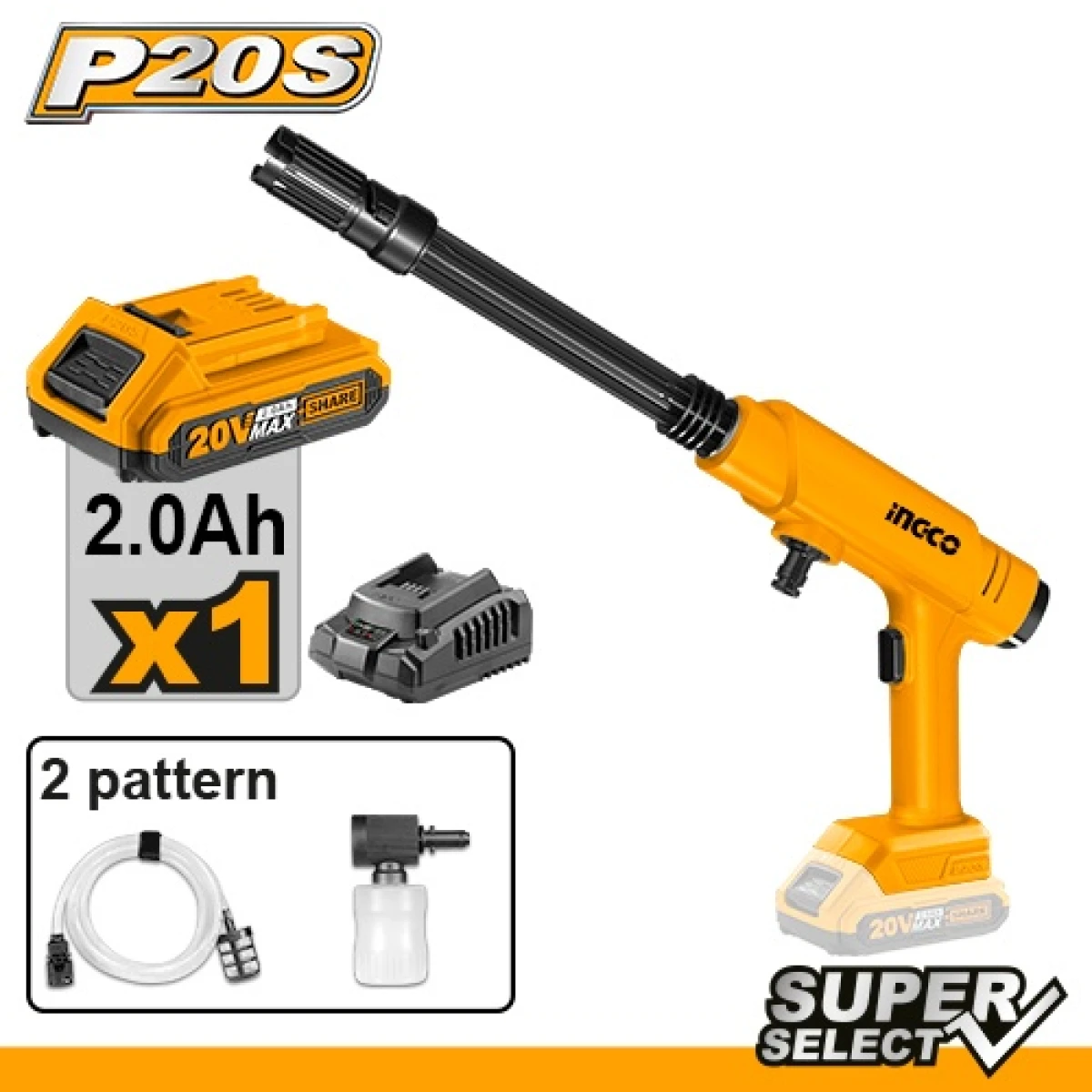 Voltaje: 20VPresión máxima: 24,5 bar.Caudal: 2,5 l/min.Sistema de AUTO STOP1 batería de 2,0 AH.1 cargador rápido.Voltaje de carga: 220-240V~50/60Hz1 juego de pistola pulverizadora de 2 patrones1 manguera de entrada de agua de 3 m con conector rápido.1 productor de espuma de 400 ml.Embalado por caja de color