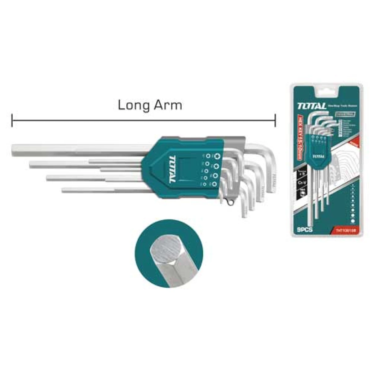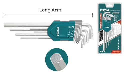 9pcs hex key set Material:Cr-V Size:1.5mm,2mm, 2.5mm, 3mm, 4mm, 5mm, 6mm, 8mm, 10mm. Long arm Heat treatment and chrome plate Packed by double blister