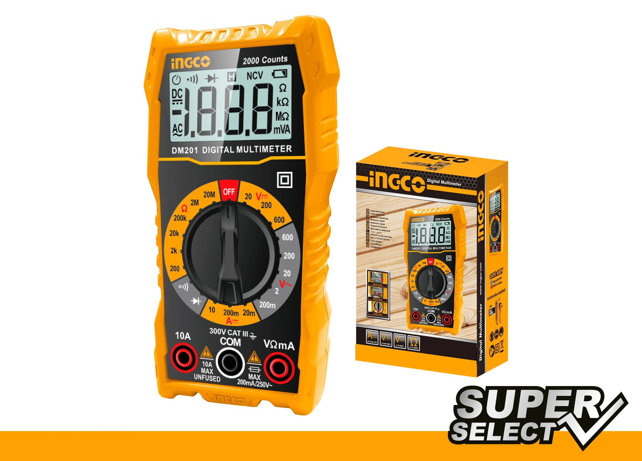 Pantalla LCD de 2000 cuentasVoltaje DC 200mV / 2V / 20V / 200V / 600VVoltaje CA 200V / 600VCorriente DC 20mA / 200mA / 10AResistencia 200? / 2k? / 20k? / 200k? / 2M? / 20M?